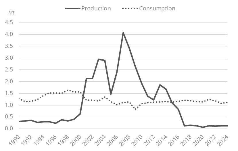 Coal and lignite production has been decreasing since its peak of 4 Mt in 2007 to 119 kt in 2024. Since 2015, the coal trade balance has reversed, with imports accounting for 93% of coal consumption in 2024.