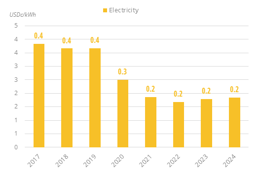 Electricity prices in the residential sector have increased by 5%/year since 2022, reaching US$1.85c/kWh in 2024. Prices had been on a downward trend since 2017.