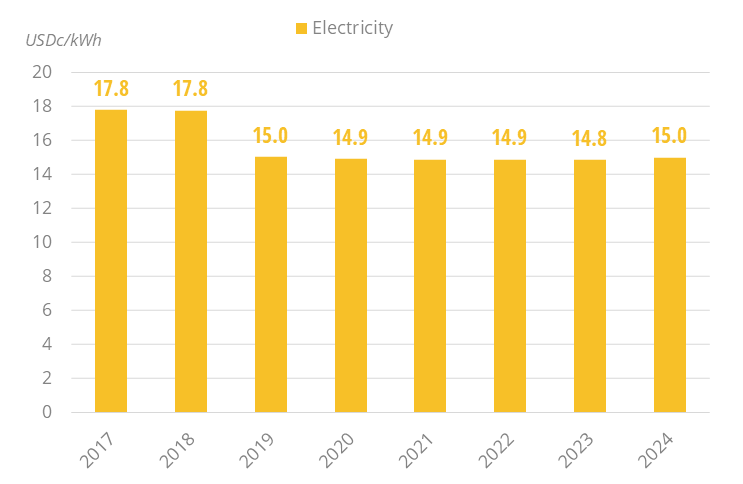 Since 2019, electricity prices for households are relatively stable, at USD15c/kWh, which is higher than most ASEAN countries.