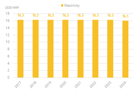 Electricity prices for industry have been rather stable since 2017 (US$16.1c/kWh in 2024).