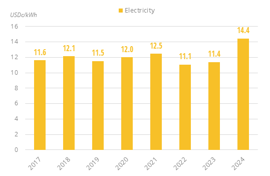 The electricity prices for households in dollars rebounded by 14% in 2024 (reaching US$14.8c/kWh), after increasing by 3% in 2023.