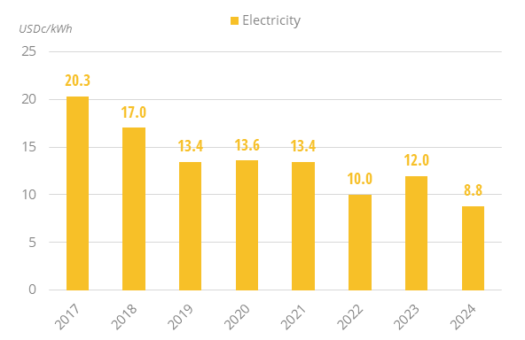 Electricity prices for industry in dollars declined by 27% in 2024 to USD8.8c/kWh.