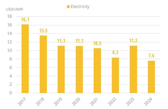 Electricity prices in residential in dollars declined by 32% in 2024 to USD7.6c/kWh.