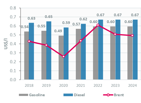 The prices of gasoline and diesel are stable since 2022 (US$ 0.60/l and US$ 0.67/l, respectively); they increased by 75% between 2015 and 2019 (15%/year), as a result of the 2016 deregulation of oil prices.