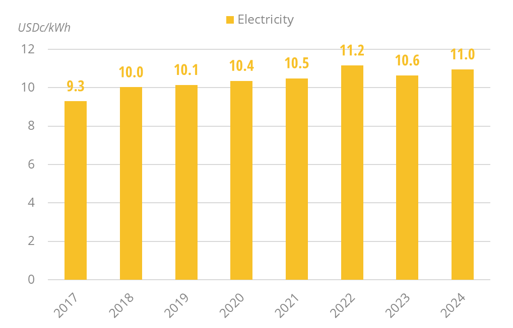 - The power mix is dominated by hydroelectricity (52% on average), followed by natural gas (40%).