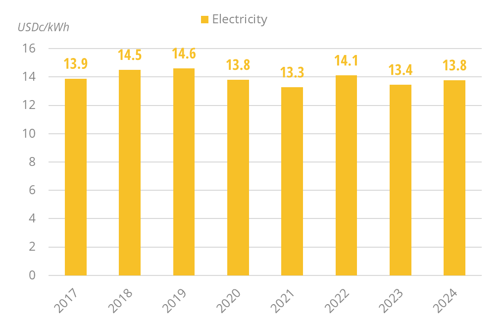 Residential electricity prices have been fluctuating around US$c14/kWh since 2017 (US$c13.8/kWh in 2024).