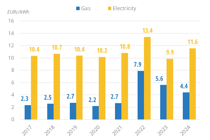 - Gas prices are 30% below the EU average, while electricity prices are only 5% below.