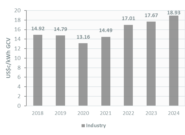 In 2024, gas prices increased by around 7% to reach US$18.9c/kWh for industry. Since 2020, they have increased by 43%. They are much higher than in neighbouring countries.