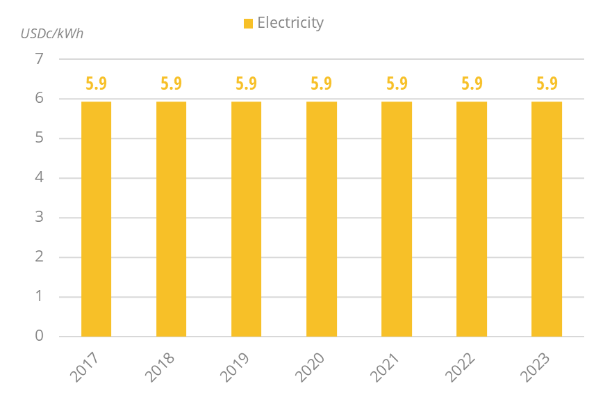 Each emirate decides its prices independently. Electricity prices are dependent on natural gas prices. This price has remained stable since 2017 at 5.9 USDc/kWh), after a rise by almost 30% in 2017.