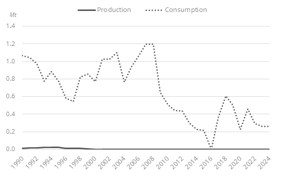 Coal production stopped in 2000. Consumption is around 0.3 Mt since 2021.