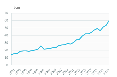Gas consumption increased by 12%/year between 2020 and 2023 to 60 bcm, after a progression of 5% in 2022. Previously, it had been increasing by more than 6%/year over 2010-2019.
