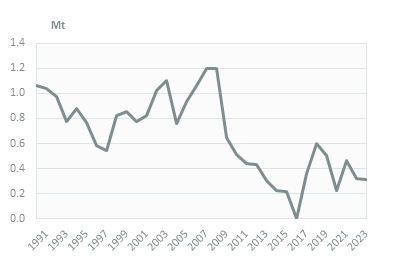 Around 1/3 of the crude oil production is exported (22 Mt in 2023); that figure has been decreasing over time (-2%/year on average since 2012).