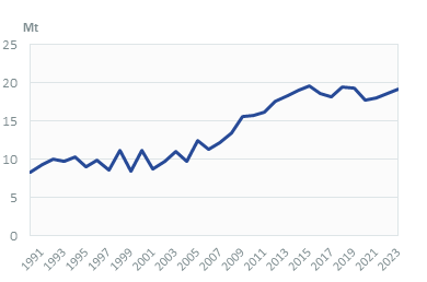 Oil production (crude oil and NGL) decreased by 3% in 2023 to 60.9 Mt, after a 7% progression in 2022. In 2021, there was slight growth of 1%, after a significant decrease of 11% in 2020. Oil production was stable over 2012-2019 at around 67 Mt, following a period of decline since 2007 from 88 Mt.