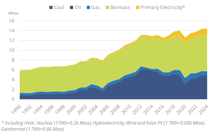 Total primary energy consumption has remained roughly stable at its 2019 level since 2021 (around 14 Mtoe), after a growth by around 2%/year since 2010. Per capita energy consumption is around 0.38 toe. In 2024, biomass (52%) and oil (35%) were the two main sources of primary energy mix.