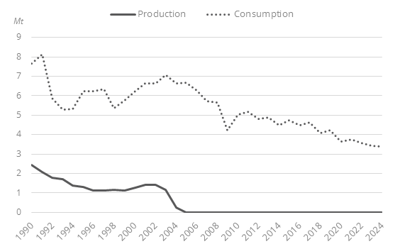 All the coal consumed is imported. Coal consumption halved between 2004 and 2024 to below 3.4 Mt (-1%), corresponding to an average decrease of 4%/year over 2019-2024 and of 2%/year over 2010-2019.