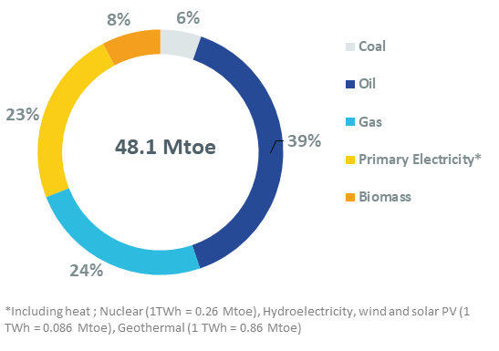 All the oil is imported (57 Mt in 2024). Crude oil accounts for around 58% of oil imports. In 2024, 21% of crude oil was imported from OPEP countries, Norway (18%), the US (18%), the UK (6%), and Kazakhstan (12%).