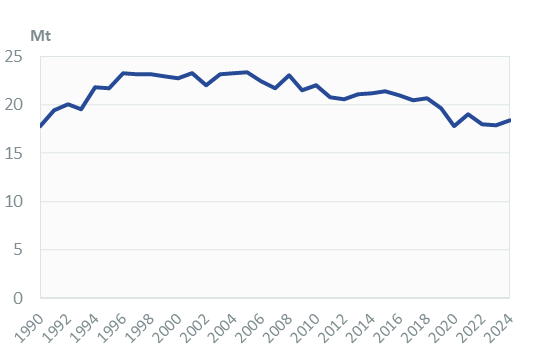 Coal consumption started a downward trend in 1990; it decreased by 3.5%/year over 2010-2023 and slightly increased in 2024 to 3.8 Mt.
