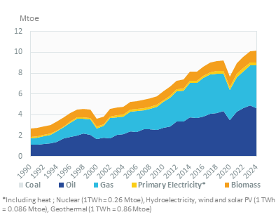 Total energy consumption has increased rapidly since 2020 (7%/year), reaching 10.1 Mtoe in 20242. It grew rapidly between 2010 and 2019 (4%/year).