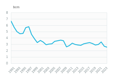 Natural gas production is negligible (around 10 mcm) and accounts for less than 1% of the domestic supply (2024). Imports have averaged 3 bcm/year since 2010, with a peak at 3.3 bcm in 2021, followed by two years of decline and a 5% hike to 2.7 bcm in 2024.