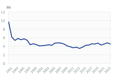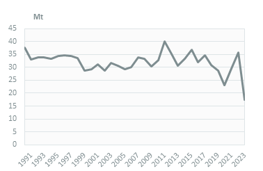 Lignite production has more than halved since 2022 (36 Mt), reaching 15 Mt in 2024, due to a falling demand from the power sector. It followed a declining trend between its 2015 peak (36 Mt) and 2020 (23 Mt), before rebounding by around 26%/year in 2021 and 2022, in a context of high demand from the power sector in 2022 with lower hydro generation and high gas prices. Certain non-profitable mines with bad quality lignite were closed. Production covers 98% of coal and lignite consumption and imports are limited (below 0.5 Mt in 2024, -25% on 2023).
