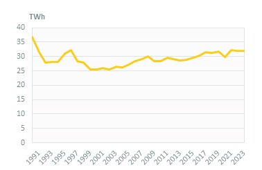 In its updated NECP (2025), the country set a target of 35% of renewables in final energy consumption in 2030, including 49.3% for electricity, 44% for heating and cooling, and 29.9% for transport (including a contribution of renewable fuels of non-biological origin). This share was 22.5% in 2023 (19% in 2022), including 29.4% for electricity, 34.9% for heating and cooling, and 8.1% for transport. The 2020 target of 16% of renewables in final consumption was exceeded in 2012.