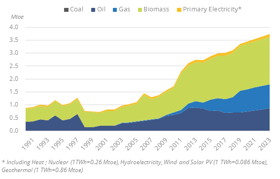 Total energy consumption has increased by 3%/year since 2020, reaching 3.7 Mtoe in 2023, after strong growth of 8% in 2019. In 2023, total energy consumption per inhabitant was around 0.6 toe (0.2 toe without biomass), in line with the Sub-Saharan Africa average.