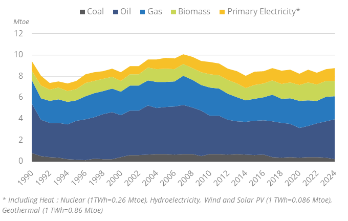Total energy consumption grew by 1.5% in 2024 to 8.8 Mtoe after a 3.2% decrease in 2022 and a 3.9% rebound in 2023. It declined by almost 1%/year on average between 2010 and 2019 and was back to its 2019 level in 2023.