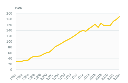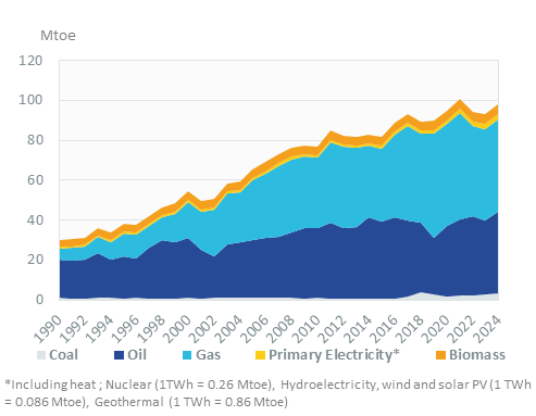Primary consumption showed a considerable growth of 5% in 2024 reaching 98 Mtoe after two consecutive years of decline in 2023 (-1%) and 2022 (-6%). It grew on average by 2.5%/year from 2010 to 2021.