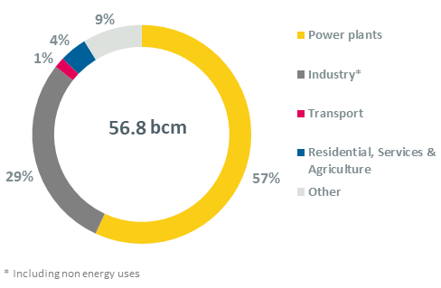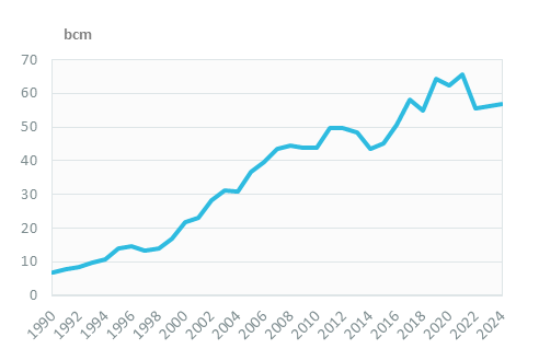Gas production has been decreasing very rapidly since its peak in 2021 at 71 bcm (-14%/year), reaching 45 bcm in 2024. This decline is due to a reduction at the main natural gas field - Zohr. Gas production grew rapidly following the commissioning of the Zohr field in 2017 (+7%/year over 2017-2021). Egypt is the second largest gas producer in Africa after Algeria, close to Nigeria. The Mediterranean Sea represents the largest share of gas production with 62%, followed by the Nile Delta with 19% and the western desert with 18%.