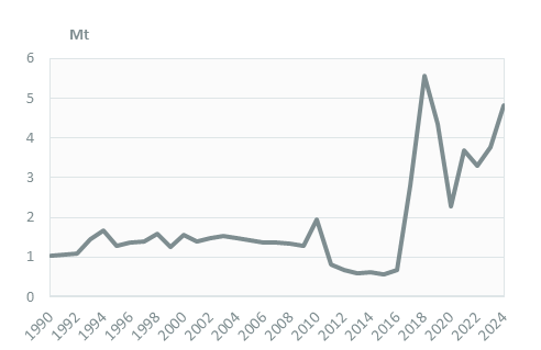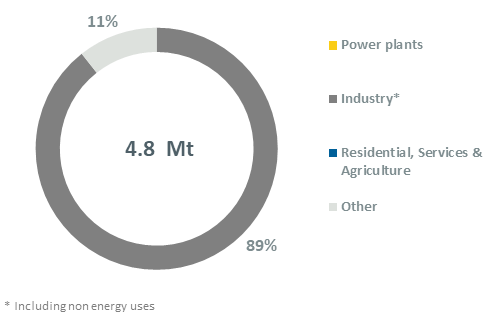 Egypt does not have any domestic production of coal and depends on imports. Coal consumption has increased rapidly since 2020 (+20%/year), reaching 4.8 Mt in 2024, a level close to its pre-Covid level. Coal is dominantly used in the industrial sector (89%), in addition to replacing gas when its prices increase.
