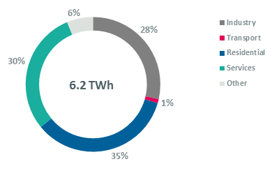 Since 2010, gas consumption has halved, with an accelerated decrease of 19%/year between 2021 and 2023 to 300 mcm. This can be explained by high prices in recent years, the progressive conversion of heat producers to other fuels (especially biomass), and the closure of a large fertiliser plant in 2014.