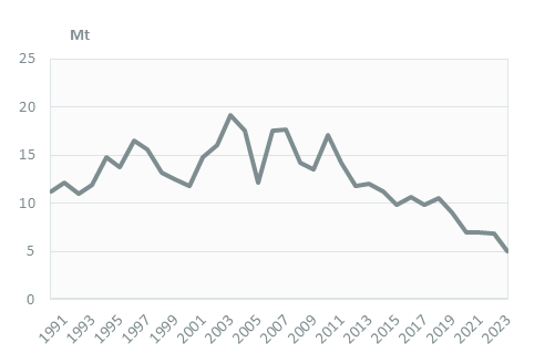 In 2023, coal and peat consumption decreased by 29% to 5 Mt. Coal and peat consumption, which had remained roughly stable between 2015 and 2018, fell by 15% in 2019 and 23% in 2020 and remained stable in 2021 and 2022 at around 7 Mt (of which, 60% peat), due to lower demand from the power sector.