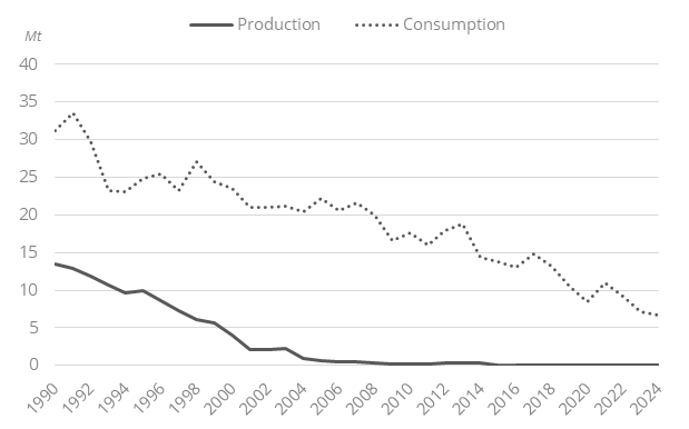 All the coal is imported (5.5 Mt in 2024) since coal production stopped in 2004. In 2023, Australia (31%), the US (16%) and Russia (15%) were the main suppliers.