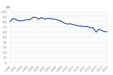Imports of crude oil declined by 2% in 2024 to 45 Mt, after an 11%/year increase over 2021-2023, while the production of petroleum products remained stable at 47 Mt, after growing by 14%/year over 2022-2023. As a consequence, imports of oil products rose by 1% in 2024 to 38 Mt, after falling by 9%/year in 2022-2023.