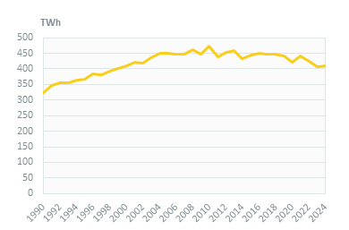 After a peak at 472 TWh in 2010, electricity consumption decreased by an average of 1%/year until 2023 and then remained stable in 2024, reaching 410 TWh (4%/year over 2021-23). Because of the importance of electric space heating, consumption trends are influenced by climate variations. At normal climate, the reduction has been slower (-0.6%/year over 2010-2023 and -4%/year over 2021-2023).