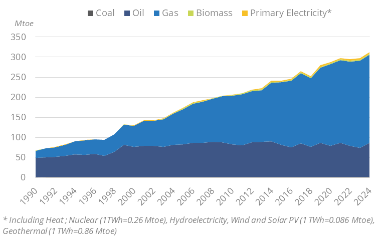 Energy consumption is increasing rapidly (3%/year since 2010) and stood at 313 Mtoe in 2024. Per capita energy consumption stands at 3.4 toe (similar to that in the Middle East or the EU average)