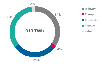 Industry accounts for 34% of electricity consumption, followed by services (33%) and households (29%).