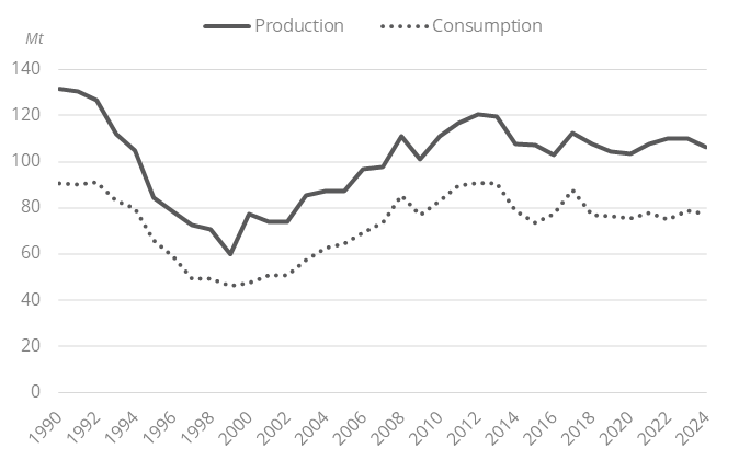 Coal production decreased by 3% in 2024 to 106 Mt. It has been broadly stable at around 107 Mt since 2014. Coal production is mainly located in the Karaganda (13 mines) and Ekibastuz (3 mines) basins. Nearly 30% of the coal production is exported (27% in 2024).