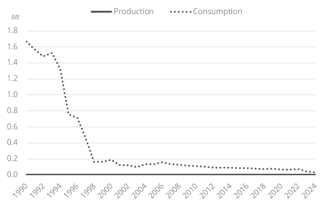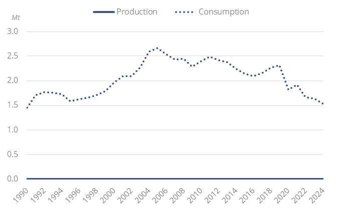 Oil products are mainly imported from Belgium and amounted to around 2.3 Mt since 2024.