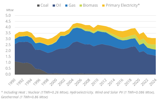 Primary energy consumption has been decreasing rapidly since 2019 (-4%/year) with an important decrease in 2022 (-12%). It fluctuated around 4 Mtoe from 2010 to 2019. The country's consumption per capita was 4.6 toe in 2024, which is around twice the EU average. Part of this high consumption is linked to steel production and to fuel tourism for motor fuels.