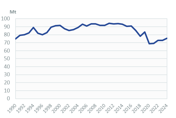 The demand for coal decreased by 6%/year over 2022-2024 to 13.6 Mt, after a 34% rebound in 2022. It decreased rapidly over 2011-2018 (-4.5%/year on average), with more striking reductions in 2020 (-27%) and 2021 (-12%).