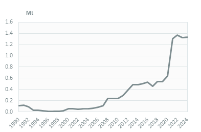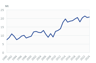 Coal consumption is marginal (less than 3 2 Mt in 20232024) and is exclusively used in the industry sector.