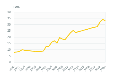 Since 2012, eElectricity consumption demand has deincreased by 3% in 2024 to 33 TWh, after 2 years of rapid growth (10%/year from 2021 to 2023) and a moderate progression between 2013 and 2021 1(2.3%/year), reaching 28 33 TWh in 20232024, due to slow economic growth (2.4%/year), compared to 11%/year over 2001-2012 (7.5%/year for GDP).