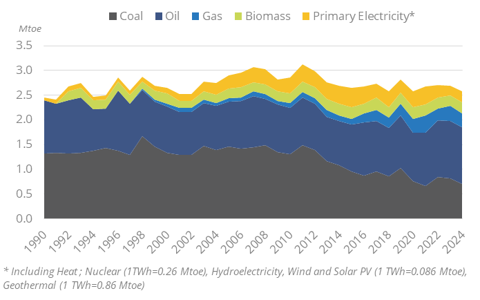 Total energy consumption declined in 2024 by 4% to 2.6 Mtoe in 2024, after fluctuating around 2.7 Mtoe from 2013 to 2023. In 2024, the country's energy consumption per capita was 1.4 toe, 44% below the European average.