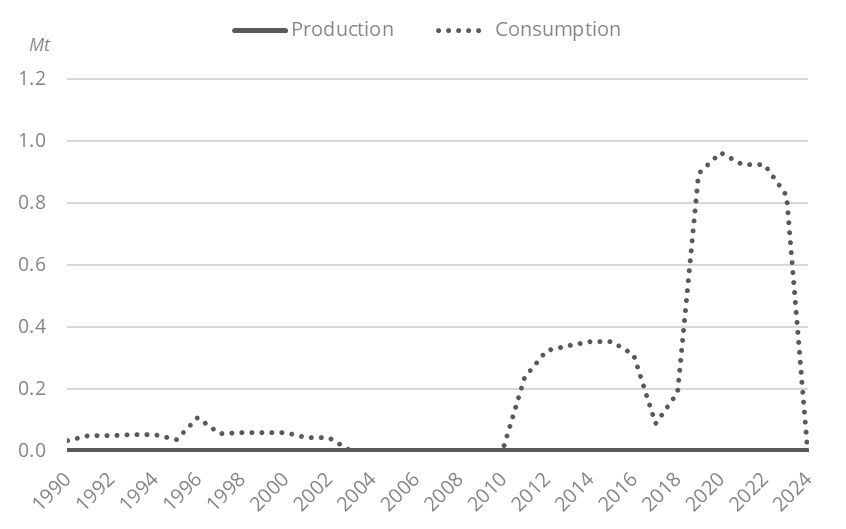 Panama does not produce coal and used to import coal (between 87 kt and 965 kt between 2011 and 2023) for a coal-fired power plant located at a copper mine. Since the power plant was mothballed in 2024, coal imports and consumption have fallen to zero.