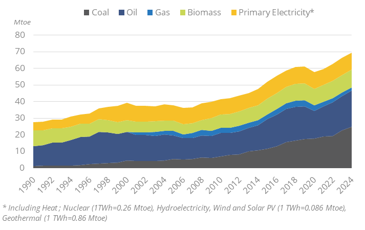 Total energy consumption has been increasing by 4.8%/year since 2020, reaching 70 Mtoe in 2024, after a 5.6% drop in 2020. Previously, it had been increasing by 4.4%/year since 2009, reaching 61 Mtoe in 2019. Per capita consumption is 0.6 toe (2024), which is much lower than the Asian average (-65%).