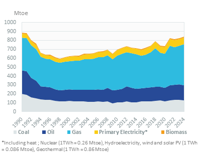Primary energy consumption has increased by 2%/year since 2022, reaching around 840 Mtoe in 2024. This trend was in line with the average growth experienced from 2010 to 2021. Total per capita consumption reached 5.9 toe in 2024.
