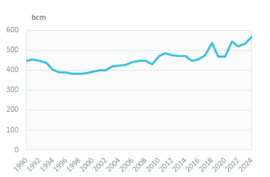 Gas production increased by 7.4% in 2024 to 706 bcm, after dropping by 5.5% in 2023 and by 12% in 2022. In 2021, it had rebounded by almost 10%, after a 6% drop in 2020. It had increased by about 5%/year between 2015 and 2019. Russia is the second largest gas producer in the world behind the USA.