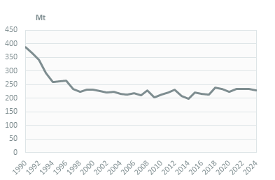 In 2025, the Russian government issued a decree requiring the country to reduce GHG emissions to 65-67% of 1990 levels to 2-2.1 GtCO2eq by 2035. In its first NDC (2020), the country set the target to cut GHG emissions to 70% of their 1990 level in 2030 to 2.2 GtCO2eq, taking into account the maximum possible absorptive capacity of forests.