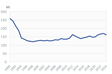 Coal and lignite production increased slightly in 2024 (+1.2%) to 431 Mt, after a 1% decrease in 2023. Production had rebounded by about 10% in 2021 and remained stable in 2022 at 433 Mt. Prior to that, it increased very rapidly, by around 6%/year on average, between 2015 and 2019 and dropped by 9% in 2020. Russia is the world's 6th largest coal producer. Almost 2/3 of the production comes from open mines. The production mainly comes from the Kuznetsk basin (65%).